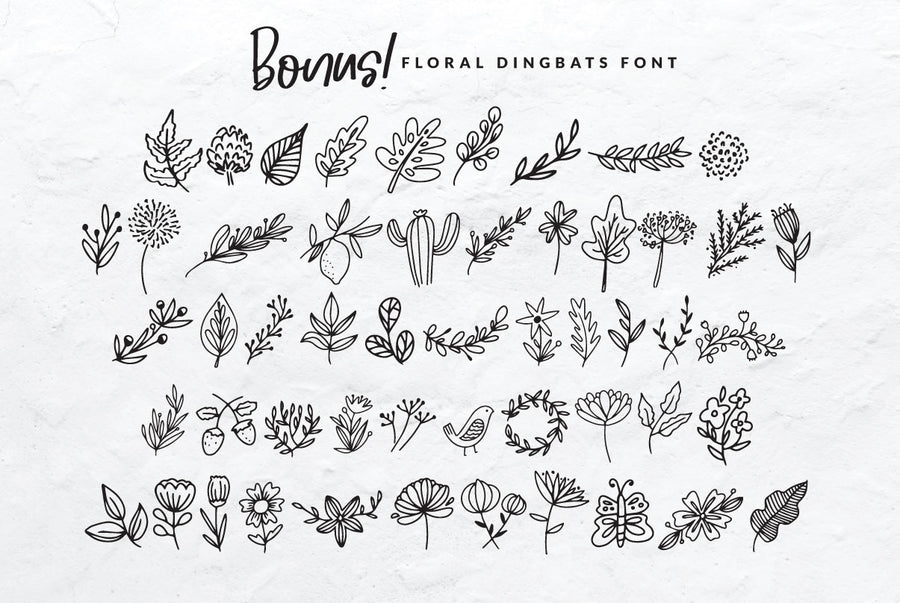 - Bonus font including Floral dingbat graphics